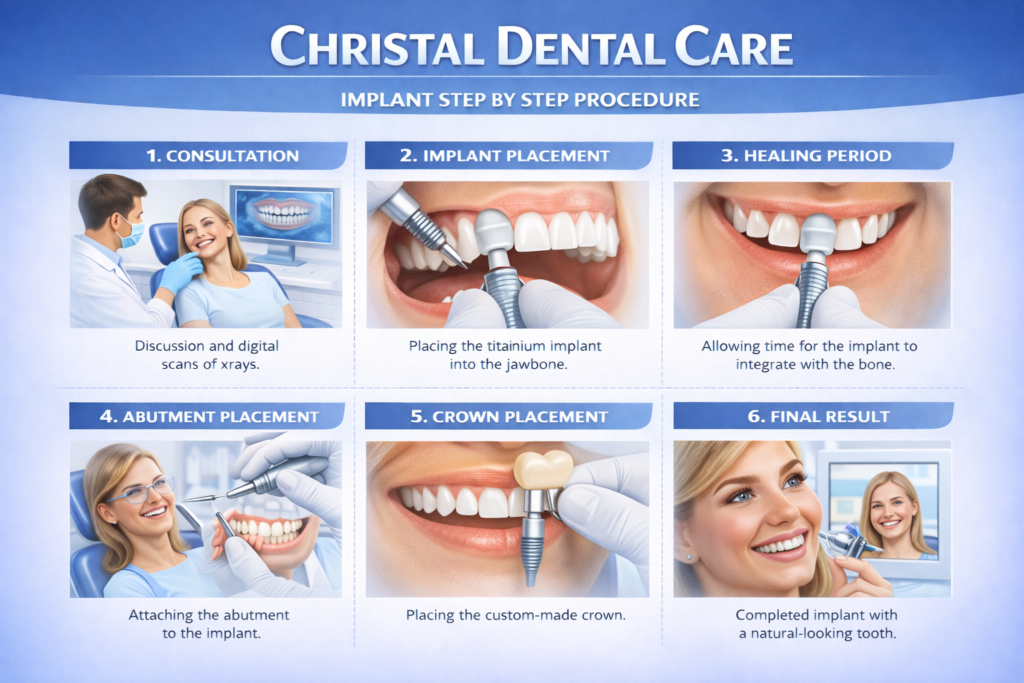 Fixing the Crown – A custom-made tooth (crown) is placed on the abutment, completing the restoration.